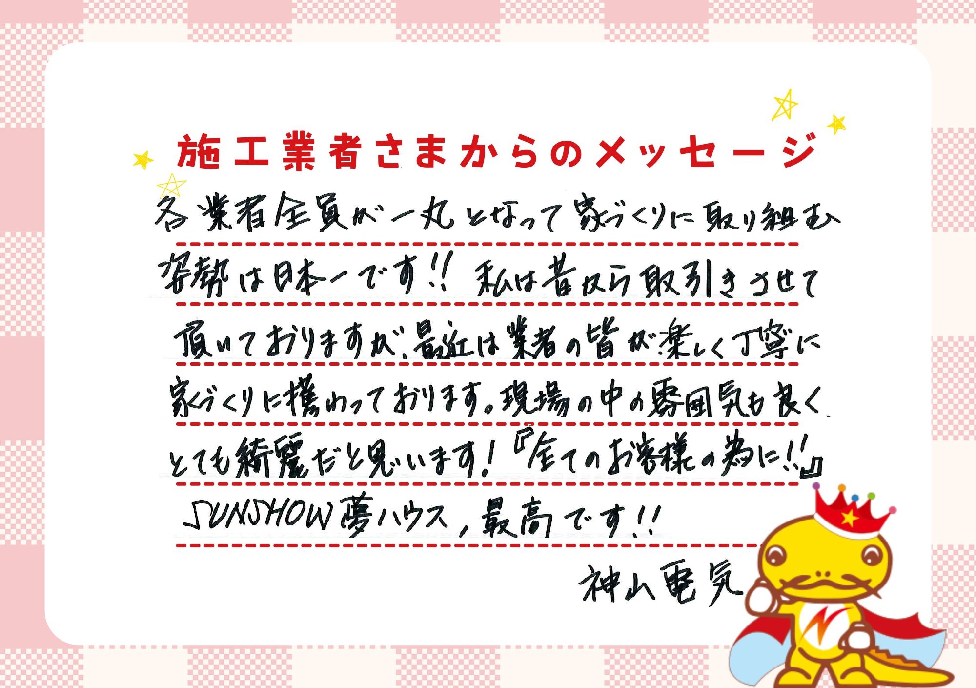 そんな思いから、SUNSHOW夢ハウスを実現させることを決意しました。