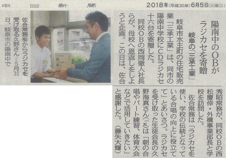 岐阜市立陽南中学校の皆様へCDラジカセを贈らせて頂きました。