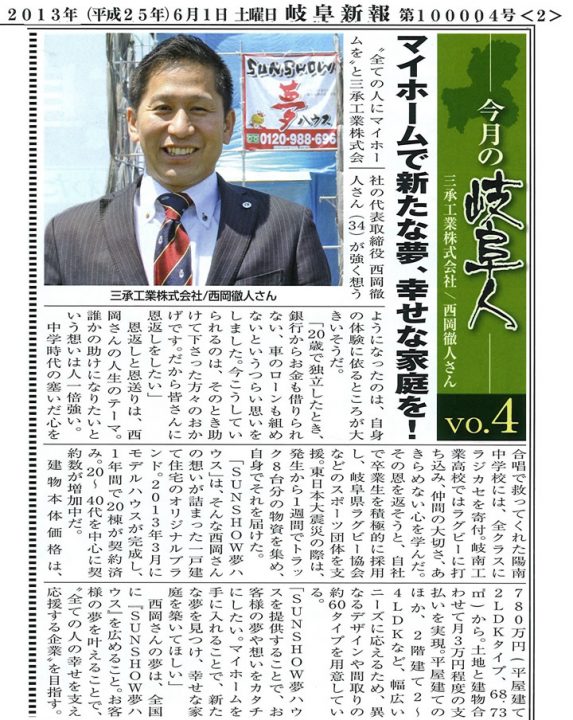 今月の岐阜人に取り上げていただきました。 SUNSHOW夢ハウスについての想い…