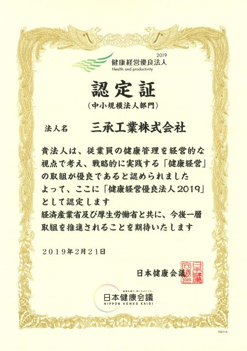 2019年2月21日、三承工業株式会社は健康経営優良法人2019に認定されました…