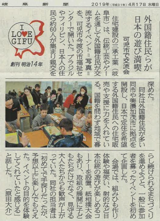 可児市福祉センターにて行った国際交流会の様子を取り上げていただきました。