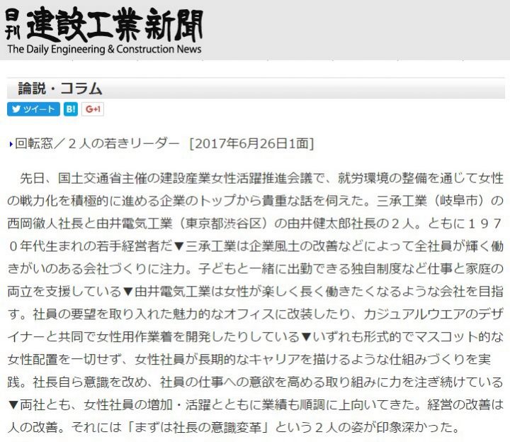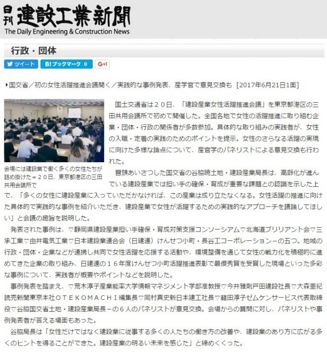 日刊建設工業新聞コラムに国土交通省主催の「女性活躍推進会議」について記事を掲載し…