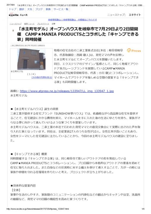 7/8、7/9に開催した「キャンプのできる家」についての記事がexciteニュー…