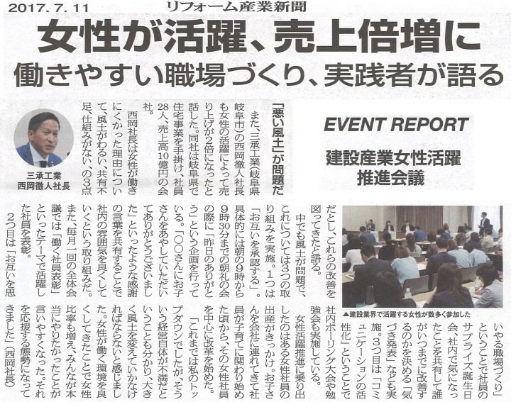 リフォーム産業新聞に国土交通省主催の「建設産業女性活躍推進会議」について記事を掲…