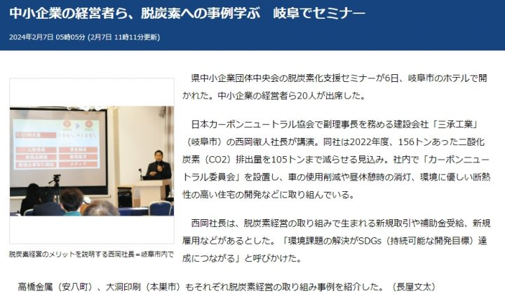 岐阜県中小企業団体中央会が主催した脱炭素化支援セミナーにおいて「中小企業における…
