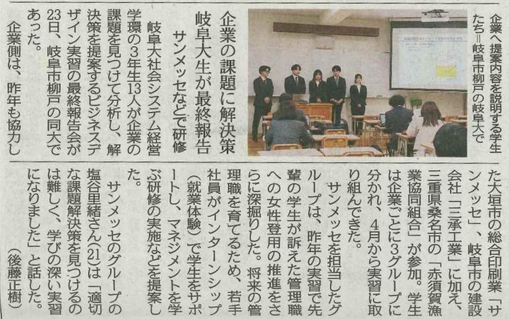 12月23日に岐阜大学で行われたビジネスデザイン実習の最終報告会について紹介され…