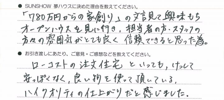 色々な方法を考えて下さり素敵な家を建てることが出来ました